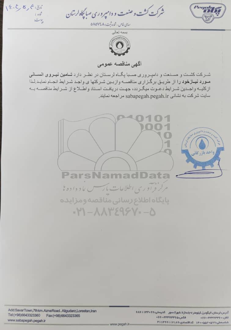 شرکت کشت و صنعت و دامپروری صبا پگاه لرستان در نظر دارد تامین نیروی انسانی مورد نیاز خود را از طریق برگزاری مناقصه و از بین شرکتهای واجد شرایط انجام نماید. لذا از کلیه واجدین شرایط دعوت می گردد جهت دریافت اسناد و اطلاع از شرایط مناقصه به سایت شرکت به نشانی sabapegah.pegah.ir مراجعه نمایند.