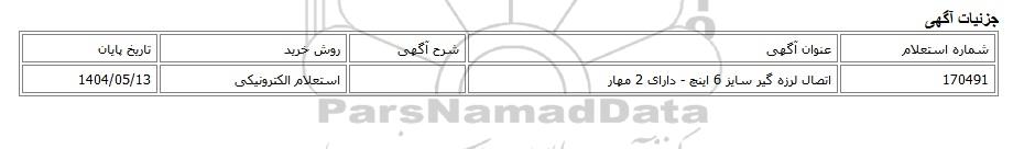 | 170491 | اتصال لرزه گیر سایز 6 اینچ - دارای 2 مهار | استعلام الکترونیکی | 1404/05/13 |