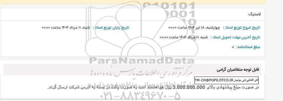 نحوه دریافت اسناد و ارسال پیشنهاد: متقاضیان میتوانند با ثبت نام در سامانه مناقصات و مزایدات ایران (پارس نماد) نسبت به مشاهده اسناد استعلام، دریافت اطلاعات تکمیلی، و ثبت پیشنهاد قیمت خود اقدام نمایند. در صورت نیاز به دریافت راهنمایی یا پشتیبانی در خصوص استعلام و مناقصه و فراخوان مناقصه عمومی، مناقصه محدود، مناقصه بین المللی، مناقصه دولتی، مناقصه خصوصی، مناقصه آنلاین فروش تجهیزات، مناقصه مشاورهای مناقصه پتروشیمی و انرژی مناقصه صنایع و تجهیزات برق و مخابرات و نفت و گاز ... لطفاً با سایت خبری مناقصه و مزایده پارسنماد دادهها به شماره 88349670 تماس حاصل فرمایید.
