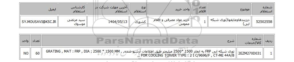 | 52502558 | درزبندهاوعایقها(توری شبکه ایی) | 1 | خرید مواد مصرفی و اقلام عمومی | کشوری | 1404/05/13 | سید مرتضی موسوی | SY.MOUSAVI@KSC.IR |