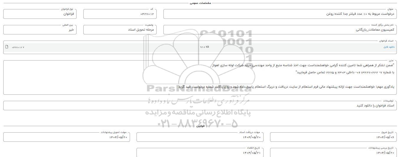 نحوه دریافت اسناد و ارسال پیشنهاد: متقاضیان می‌توانند با ثبت نام در سامانه مناقصات و مزایدات ایران (پارس نماد) نسبت به مشاهده اسناد استعلام، دریافت اطلاعات تکمیلی، و ثبت پیشنهاد قیمت خود اقدام نمایند. در صورت نیاز به دریافت راهنمایی یا پشتیبانی در خصوص استعلام و مناقصه و فراخوان مناقصه عمومی، مناقصه محدود، مناقصه بین‌ المللی، مناقصه دولتی، مناقصه خصوصی، مناقصه آنلاین فروش تجهیزات، مناقصه مشاوره‌ای مناقصه پتروشیمی و انرژی مناقصه صنایع و تجهیزات برق و مخابرات و نفت و گاز ... لطفاً با سایت خبری مناقصه و مزایده پارس‌نماد داده‌ها به شماره 88349670 تماس حاصل فرمایید.
