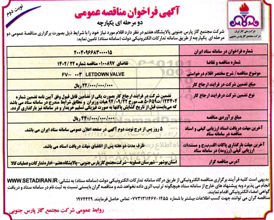 مناقصه FV -003 lLETDOWN VALVE- نوبت دوم از کلیه افراد متخصص و شرکتها واجد شرایط دعوت به عمل میآید در مناقصه با کد خبرگزاری پارس نماد: 9342049 شرکت نمایند.