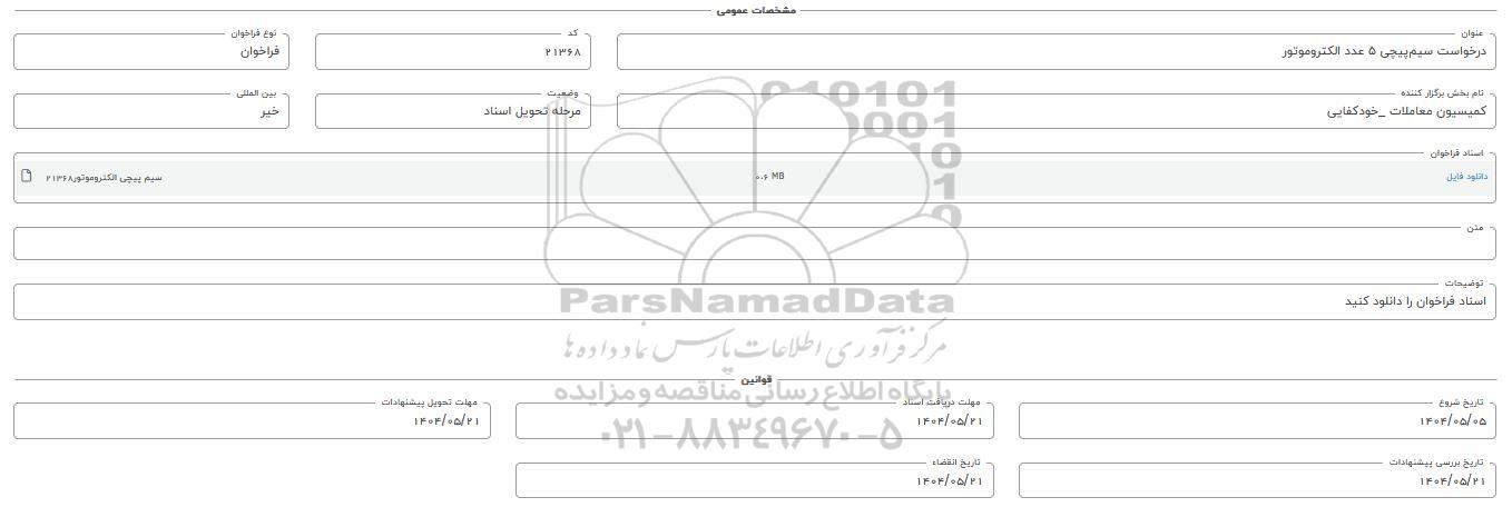 تاریخ بررسی پیشنهادات: 1404.05.21 - تاریخ انقضاء: 1404.05.21