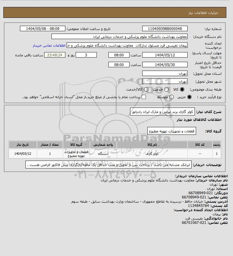 شرح کلی نیاز: کولر گازی برند ایرانی و مارک ایران رادیاتور