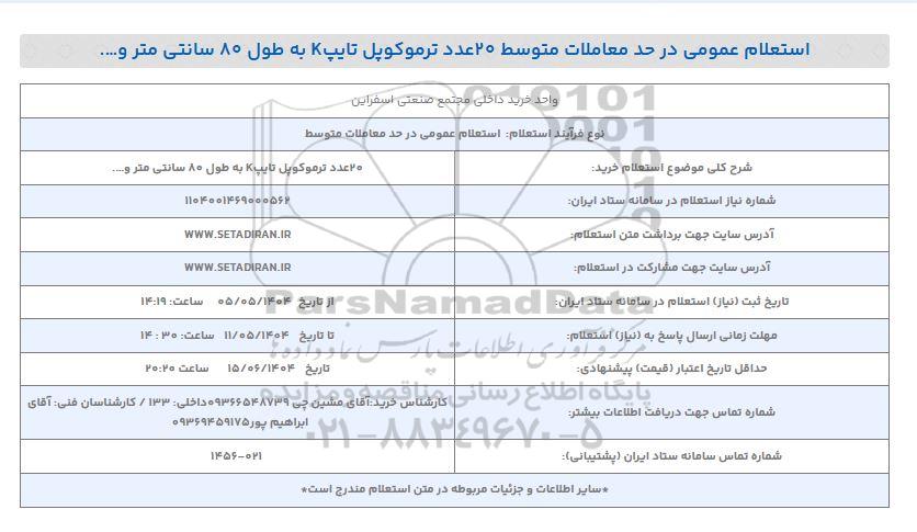 استعلام عمومی در حد معاملات متوسط 20 عدد ترموکوپل تایپ K به طول 80 سانتی متر و...