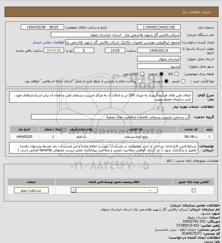 شرح کلی نیاز: انتقال لجن های هیدرو کربوری به میزان 200 تن و انتقال آن به مراکز مدیریت پسماند لجن و امحاء آن برابر استانداردهای مورد تایید سازمان محیط زیست
