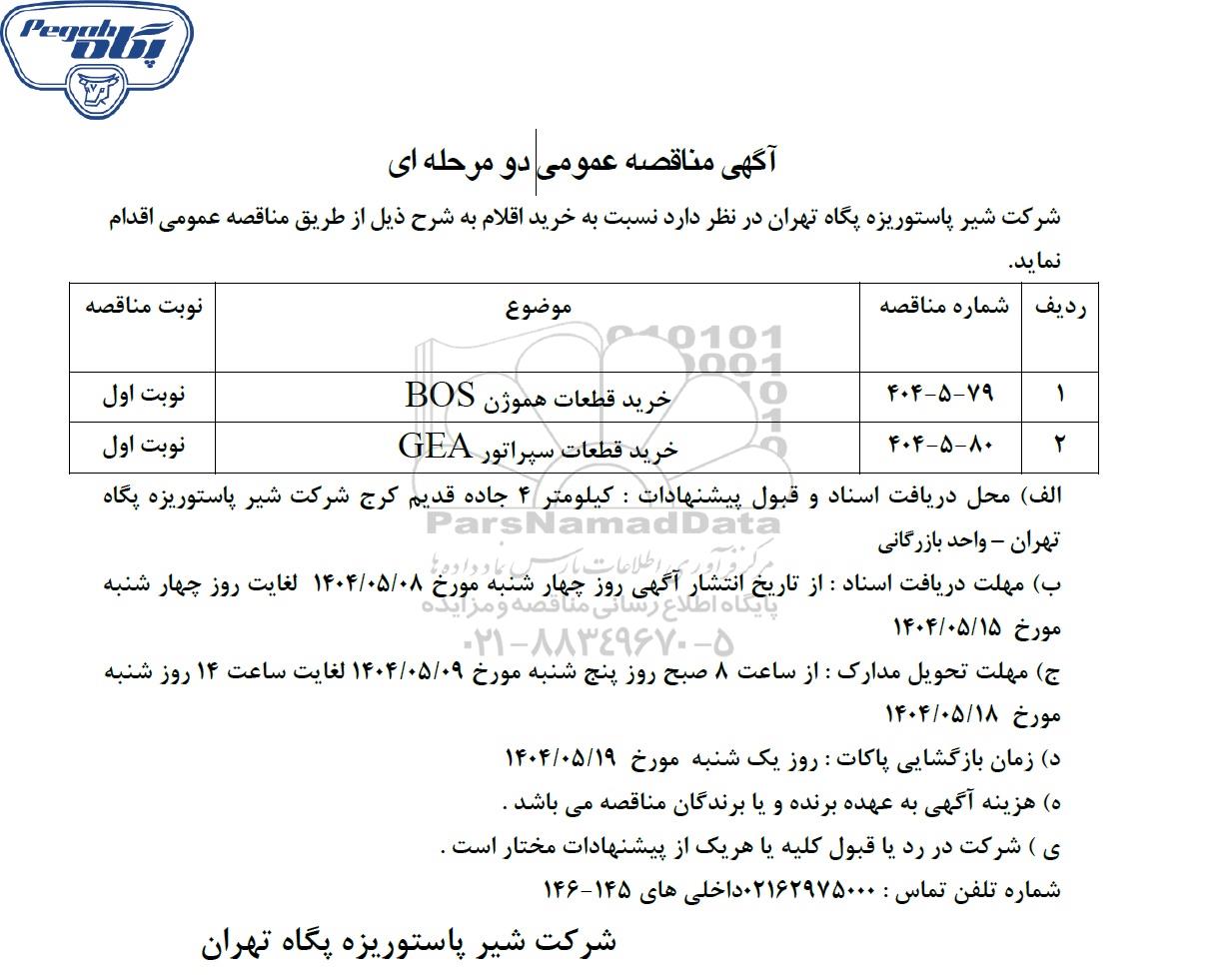 شرکت شیر پاستوریزه پگاه تهران در نظر دارد نسبت به خرید اقلام به شرح ذیل از طریق مناقصه عمومی اقدام نماید.