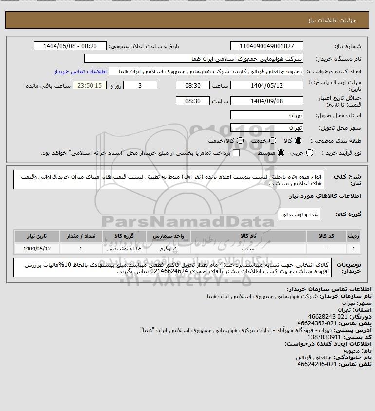 استعلام بها و موضوع استعلام استعلام انواع میوه وتره بارطبق لیست پیوست-اعلام برنده (نفر اول) منوط به تطبیق لیست قیمت هابر مبنای میزان خرید،فراوانی وقیمت های اعلامی میباشد. به اطلاع کلیه شرکتها و افراد متخصص واجد شرایط میرساند، آگهی گذار در نظر دارد از طریق استعلام بها، نسبت به انتخاب و دریافت پیشنهادات اقدام نماید. این استعلام با کد آگهی ثبت شده در سامانه خبرگزاری پارس نماد : 9342517 منتشر شده است. مشخصات استعلام : تاریخ شروع استعلام: 1404/05/08 آخرین مهلت ارسال پیشنهاد قیمت : 1404/05/12 و محل اجرای پروژه : استان تهران میباشد. استعلام قیمت مورد درخواست : استعلام انواع میوه وتره بارطبق لیست پیوست-اعلام برنده (نفر اول) منوط به تطبیق لیست قیمت هابر مبنای میزان خرید،فراوانی وقیمت های اعلامی میباشد. با دستهبندیهای تخصصی و گروه های مرتبط : مواد غذایی, استعلام اطلاع رسانی میگردد.