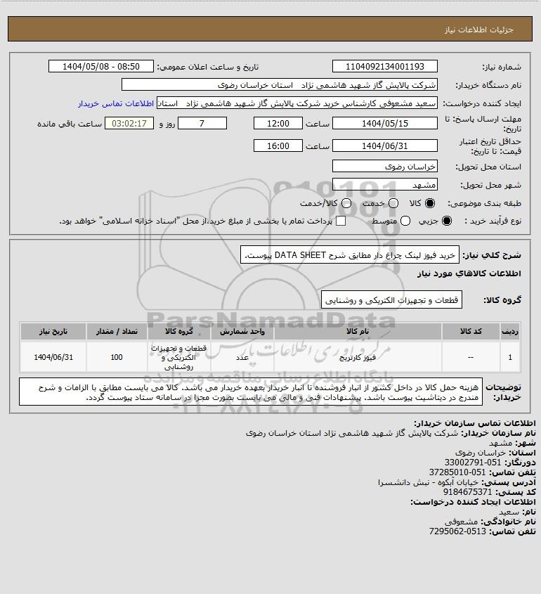 نام دستگاه خریدار:شرکت پالایش گاز شهید هاشمی نژاد استان خراسان رضوی