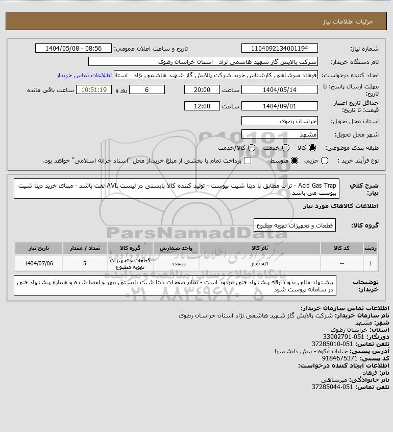 شرح کلی نیاز: Acid Gas Trap - تراپ مطابق با دیتا شیت پیوست - تولید کننده کالا بایستی در لیست AVL نفت باشد - مبنای خرید دیتا شیت پیوست می باشد