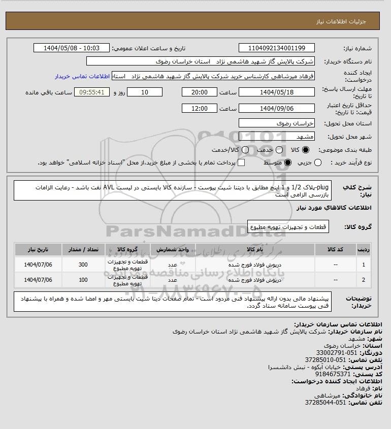 شرح کلی نیاز: plug-پلاک 1/2 و 1 اینچ مطابق با دیتنا شیت پیوست - سازنده کالا بایستی در لیست AVL نفت باشد - رعایت الزامات بازرسی الزامی است