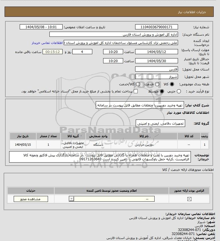 توضیحات خریدار:تهیه وخرید دوربین با نصب و متعلقات همراه با گارانتی مطابق فایل پیوست .در سامانه.بارگذاری پیش فاکتور ونمونه کالا الزامیست .کرایه حمل باوکسورات قانونی با تامین کننده است 09171263640