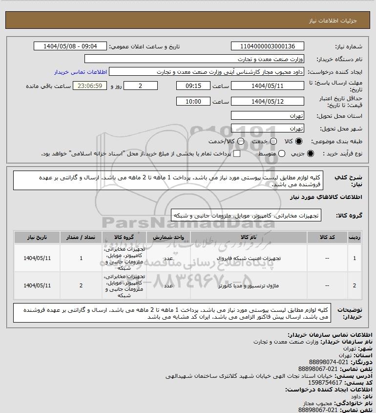 | 2 | -- | ماژول ترنسیور و مدیا کانورتر | عدد | تجهیزات مخابراتی، کامپیوتر، موبایل، ملزومات جانبی و شبکه | 2 | 1404/05/11 |
