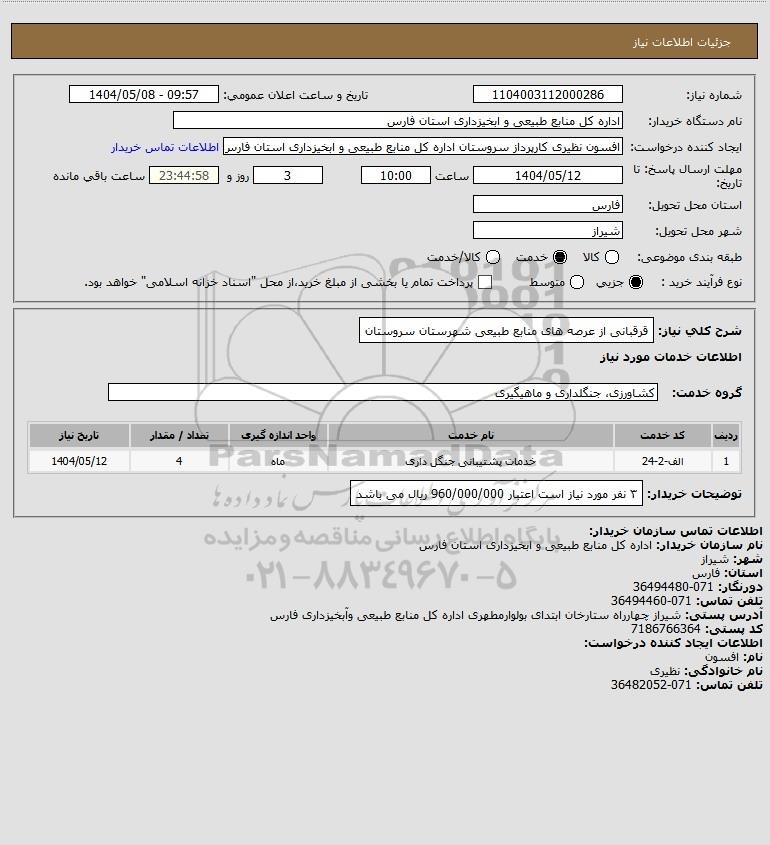 شرح کلی نیاز: قرقبانی از عرصه های منابع طبیعی شهرستان سروستان