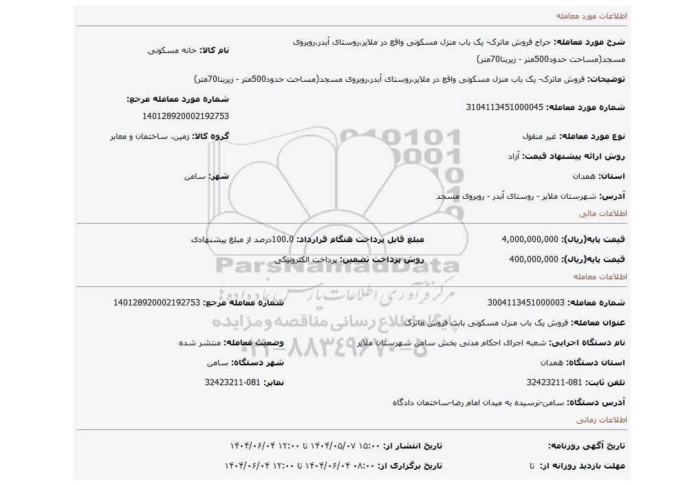| شرح مورد معامله: حراج فروش ماترک- یک باب منزل مسکونی واقع در ملایر،روستای آبدر،روبروی مسجد(مساحت حدود500متر - زیربنا70متر) | نام کالا: خانه مسکونی | |