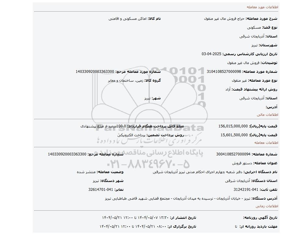 | شماره مورد معامله: 3104108527000098 | شماره مورد معامله مرجع: 140330920003363300 | |