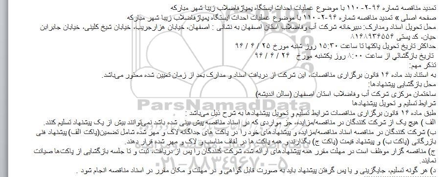 تمدید مناقصه شماره 96-2- 110 با موضوع عملیات احداث ایستگاه پمپاژفاضلاب زیبا شهر مبارکه