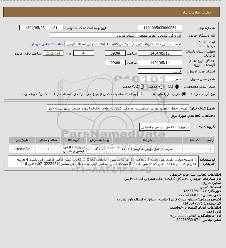 شرح کلی نیاز: تهیه ، حمل و نصب دوربین مداربسته ودزدگیر کتابخانه علامه خفری (پروژه جدید) شهرستان خفر