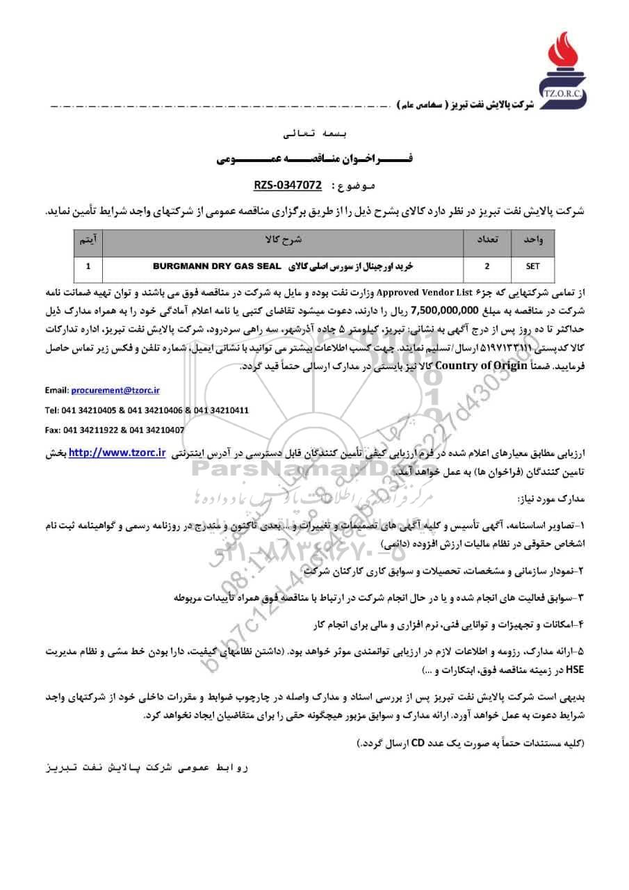 از تمامی شرکتهایی که جزء Approved Vendor List وزارت نفت بوده و مایل به شرکت در مناقصه فوق می باشند و توان تهیه ضمانت نامه شرکت در مناقصه به مبلغ 7.500.000.000 ریال را دارند، دعوت می شود تقاضای کتبی یا نامه اعلام آمادگی خود را به همراه مدارک ذیل حداکثر تا ده روز پس از درج آگهی به نشانی: تبریز، کیلومتر 5 جاده آذرشهر، سه راهی سردرود، شرکت پالایش نفت تبریز، اداره تدارکات کالا کدپستی 5197133111 ارسال/ تسلیم نمایند. جهت کسب اطلاعات بیشتر می توانید با نشانی ایمیل، شماره تلفن و فکس زیر تماس حاصل فرمایید. ضمناً Country of Origin کالا نیز به نیز بایستی در مدارک ارسالی حتما قید گردد.