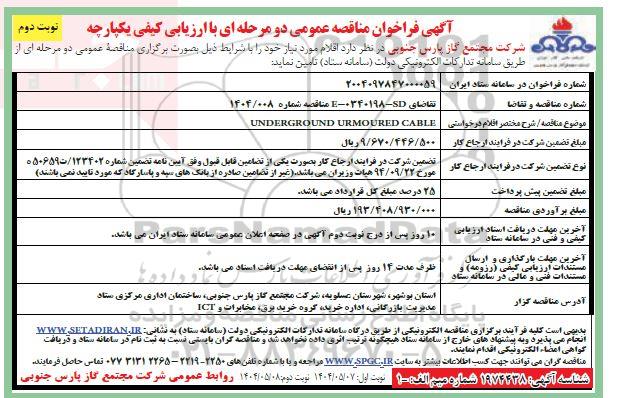 مناقصه UNDERGROUND URMOURED CABLE نوبت دوم از کلیه افراد متخصص و شرکتها واجد شرایط دعوت به عمل میآید در مناقصه با کد خبرگزاری پارس نماد: 9344785 شرکت نمایند.