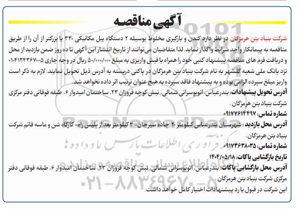 شرکت بنیاد بتن هرمزگان در نظر دارد کندن و بارگیری مخلوط بوسیله 2 دستگاه بیل مکانیکی 330 یا بزرگتر از آن را از طریق مناقصه به پیمانکار واجد شرایط واگذار نماید. لذا متقاضیان میتوانند از تاریخ انتشار این آگهی تا ده روز ضمن بازدید از محل و دریافت فرم های مناقصه پیشنهاد کتبی خود را همراه با فیش واریزی به مبلغ 50.000.000 ریال در وجه جاری 0104124367005 نزد بانک ملی شعبه گلشهر به نام شرکت بنیاد بتن هرمزگان در پاکتی دربسته به آدرس ذیل تحویل نمایند. لازم به ذکر است واریز مبلغ سپرده الزامی بوده و به پیشنهاد فاقد سپرده به هیچ عنوان ترتیب اثر داده نخواهد شد.