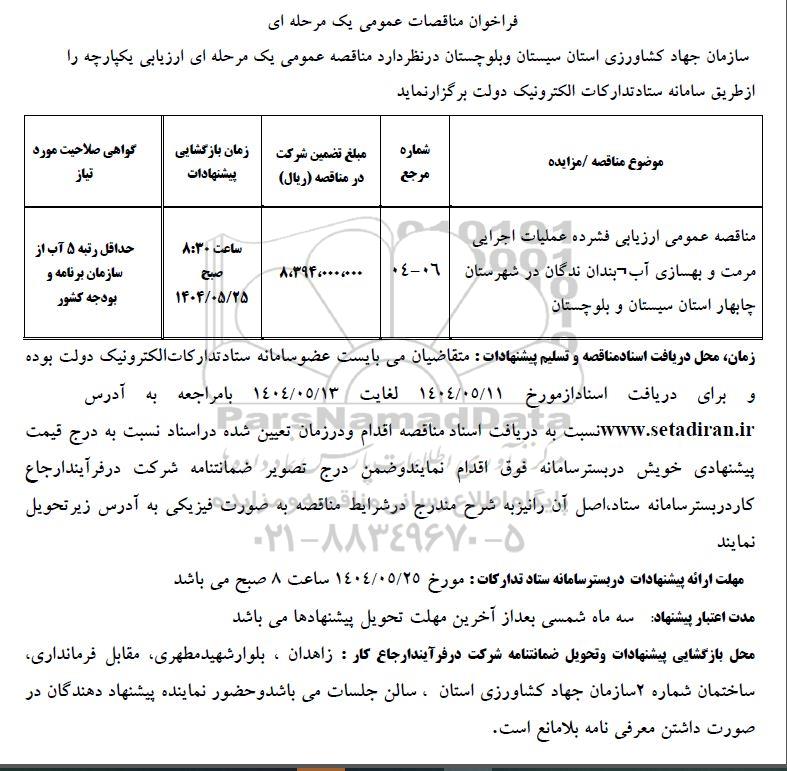 | 1 | مناقصه عمومی ارزیابی فشرده عملیات اجرایی مرمت و بهسازی آب بندان ندگان در شهرستان چابهار استان سیستان و بلوچستان | 04-06 | 8.394.000.000 | ساعت 8:30 صبح 1404.5.25 | حدتقل رتبه 5 آب از سازمان برنامه و بودجه کشور |