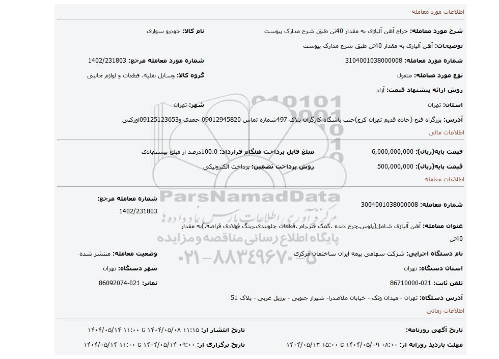 | عنوان معامله: آهن آلیازی شامل(پلوس.چرخ دنده .کمک فنر.رام .قطعات جلوبندی.رینگ فولادی قراضه.)به مقدار 40تن | ||