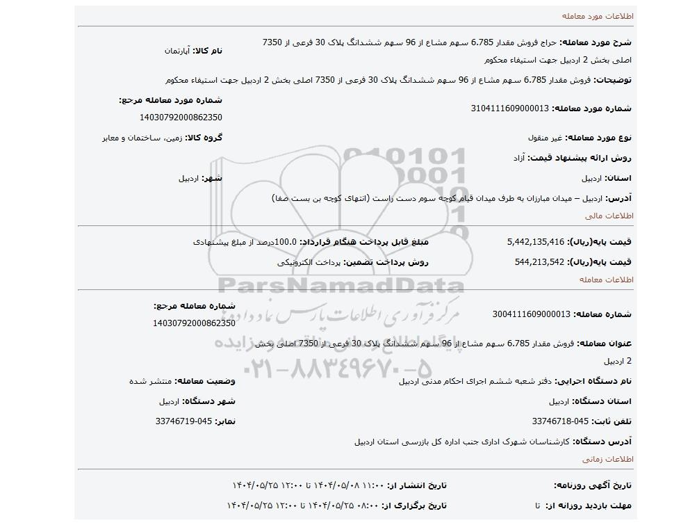 شرح مورد معامله: حراج فروش مقدار 6.785 سهم مشاع از 96 سهم ششدانگ پلاک 30 فرعی از 7350 اصلی بخش 2 اردبیل جهت استیفاء محکوم | نام کالا: آپارتمان | |