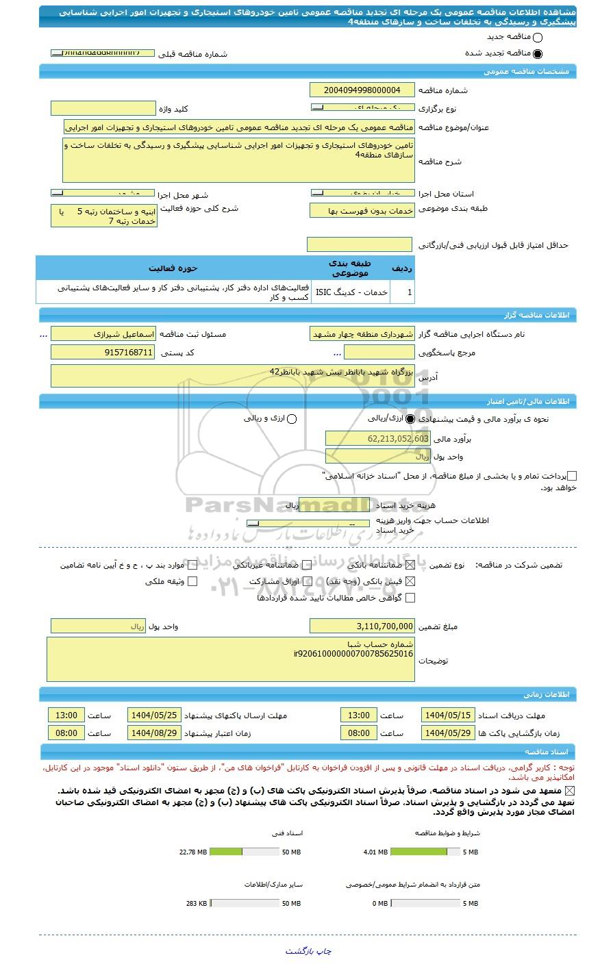 نام دستگاه اجرایی مناقصه گزارشهرداری منطقه چهار مشهد استان خراسان رضویمسئول ثبت مناقصهاسماعیل شیرازی