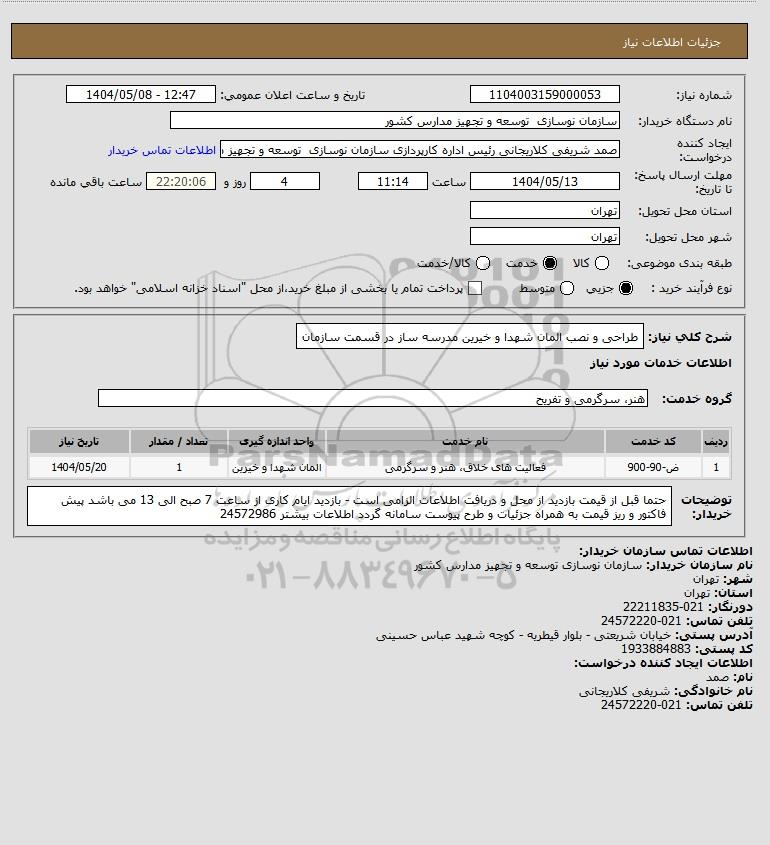 شرح کلی نیاز: طراحی و نصب المان شهدا و خیرین مدرسه ساز در قسمت سازمان