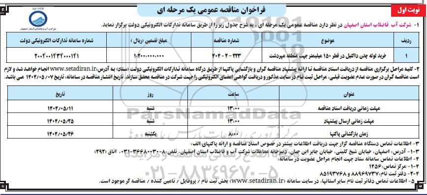 شرکت آب فاضلاب استان اصفهان در نظر دارد مناقصه عمومی دو مرحله ای به شرح جدول زیر را از طریق سامانه تدارکات الکترونیکی دولت برگزار نماید.