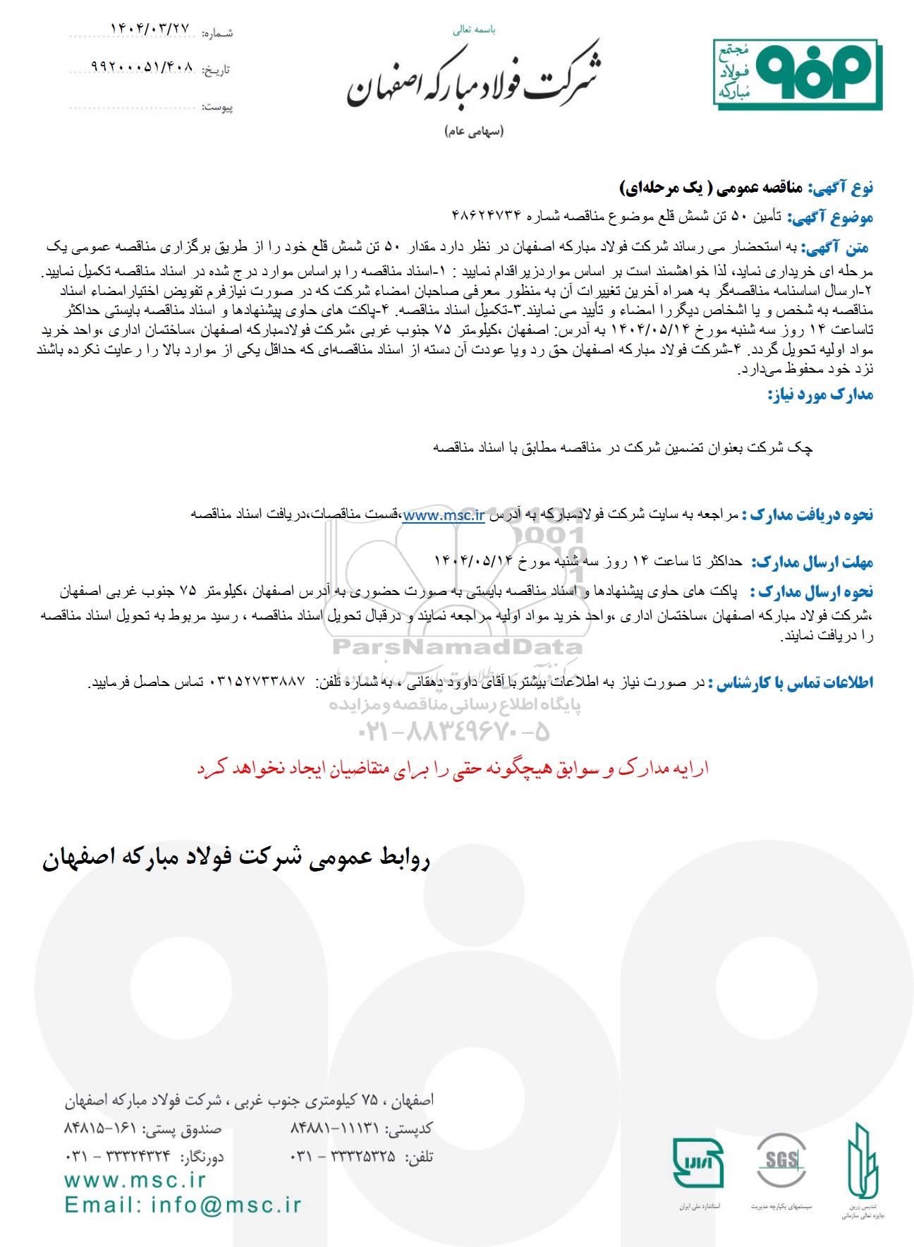 متن آگهی: به استحضار می رساند شرکت فولاد مبارکه اصفهان در نظر دارد مقدار 50 تن شمش قلع خود را از طریق برگزاری مناقصه عمومی یک مرحله ای خریداری نماید، لذا خواهشمند است بر اساس موارد زیر اقدام نمایید : 1- اسناد مناقصه را بر اساس موارد درج شده در اسناد مناقصه تکمیل نمایید. 2- ارسال اساسنامه مناقصه گر به همراه آخرین تغییرات آن به منظور معرفی صاحبان امضاء شرکت که در صورت نیاز فرم تفویض اختیار امضاء اسناد مناقصه به شخص و یا اشخاص دیگر را امضاء و تایید می نمایند. 3 - تکمیل اسناد مناقصه 4- پاکت های حاوی پیشنهادها و اسناد مناقصه بایستی حداکثر تا ساعت 14 روز سه شنبه مورخ 1404.05.14 به آدرس: اصفهان، کیلومتر 75 جنوب غربی، شرکت فولاد مبارکه اصفهان، ساختمان اداری، واحد خرید مواد اولیه تحویل گردد. 4 - شرکت فولاد مبارکه اصفهان حق رد و یا عودت آن دسته از اسناد مناقصه ای که حداقل یکی از موارد بالا را رعایت نکرده باشند. نزد خود محفوظ می دارد.