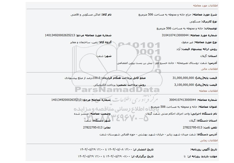 مزایده عمومی مزایده خانه و محوطه به مساحت 506 مترمربع برگزار میگردد. از کلیه افراد متخصص و شرکت‌های واجد شرایط دعوت به عمل می‌آید تا در این مزایده با کد خبرگزاری پارس نماد : 9346031 شرکت نمایند تاریخ شروع مزایده : 1404/05/08 مهلت شرکت در مزایده: تا پایان روز 1404/05/29 مکان برگزاری اموال واگذاری استان‌های گیلان و دسته‌بندی‌های مربوط به این حراجی املاک و زمین میباشد. اطلاعات دقیق‌تر درباره شرایط شرکت در مزایده آنلاین و نحوه ارسال مدارک، الزامات پروژه و دریافت اسناد مزایده و تاریخ بازگشایی پاکت‌ها، در بخش اطلاعات تکمیلی این آگهی درج شده است.