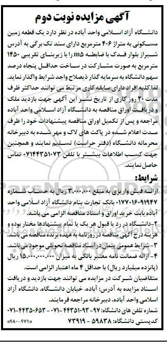 دانشگاه آزاد اسلامی واحد آباده در نظر دارد یک قطعه زمین مسکونی به متراژ 406 متر مربع دارای سند تک برگی به آدرس شیراز بلوار فدک با ضابطه m5 را با زیربنای تقریبی 1450 متر مربع به صورت مشارکت در ساخت حداقل پنجاه درصد سهم دانشگاه به سرمایه گذار ذیصلاح واجد شرایط واگذار نماید. لذا کلیه افراد دارای سابقه کاری مرتبط می توانند حداکثر ظرف مدت 20 روز کاری از تاریخ نشر این آگهی جهت بازدید ملک و دریافت اوراق مناقصه به دانشگاه آزاد اسلامی واحد آباده مراجعه و پس از تکمیل اوراق مناقصه پیشنهادات خود را ظرف مدت اعلام شده در پاکتهای لاک و مهر شده به دبیرخانه محرمانه دانشگاه دفتر حراست تسلیم نمایند و همچنین جهت کسب اطلاعات بیشتر با تلفن 07144351073 تماس حاصل نمایند.