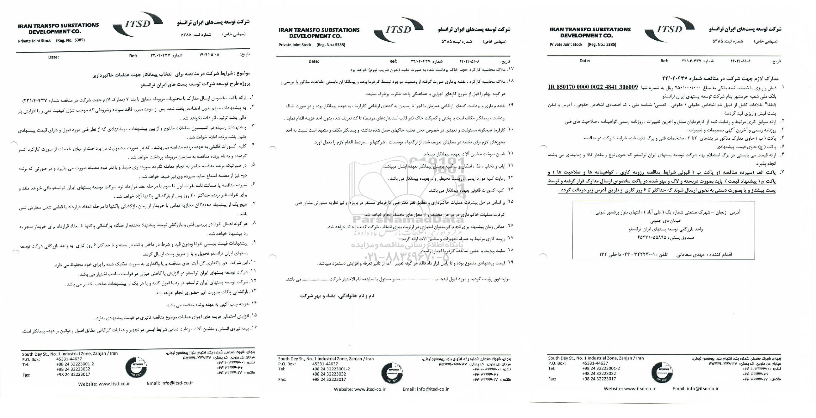 1- فیش واریزی یا ضمانت نامه بانکی به مبلغ 750.000.000 ریال به شماره شبا IR850170000000224841306009 بانک ملی شعبه خرمشهر بنام شرکت توسعه پستهای ایران ترانسفو