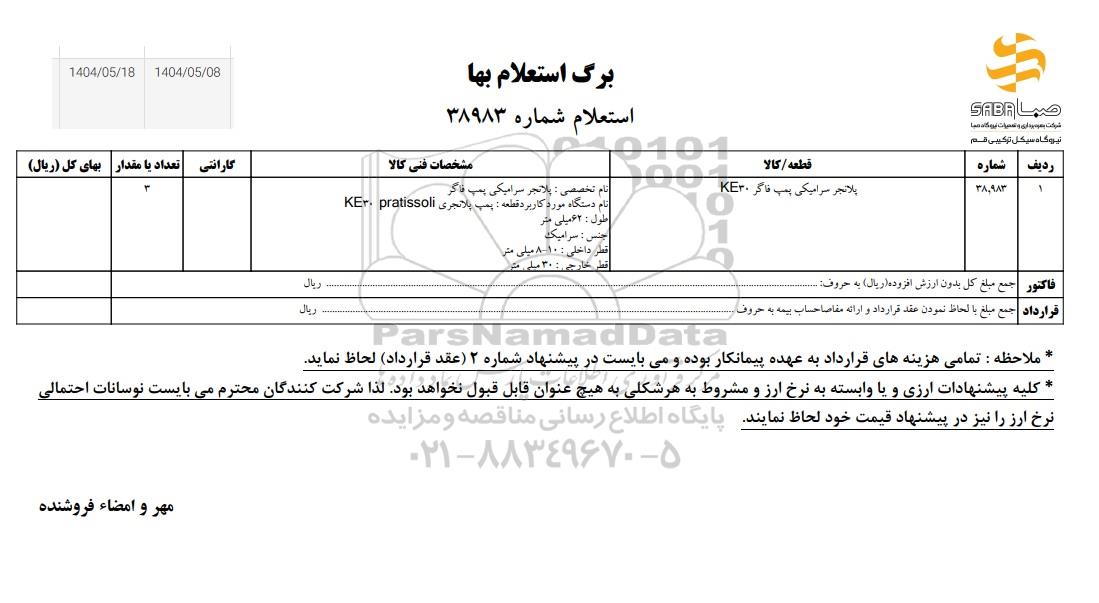 استعلام بها و موضوع استعلام استعلام پلانجر سرامیکی پمپ فاگر KE30 به اطلاع کلیه شرکتها و افراد متخصص واجد شرایط میرساند، آگهی گذار در نظر دارد از طریق استعلام بها، نسبت به انتخاب و دریافت پیشنهادات اقدام نماید. این استعلام با کد آگهی ثبت شده در سامانه خبرگزاری پارس نماد : 9346313 منتشر شده است. مشخصات استعلام : تاریخ شروع استعلام: 1404/05/08 آخرین مهلت ارسال پیشنهاد قیمت : 1404/05/18 و محل اجرای پروژه : استان قم میباشد. استعلام قیمت مورد درخواست : استعلام پلانجر سرامیکی پمپ فاگر KE30 با دستهبندیهای تخصصی و گروه های مرتبط : الکتروموتور و پمپ های شناور, انواع مواد و قطعات نسوز, نیروگاه, تجهیزات برق و الکترونیک, استعلام اطلاع رسانی میگردد. شرایط شرکت در استعلام آنلاین : ابتدا ثبت نام در سامانه استعلام پارس نماد و تکمیل مدارک موردنیاز و بارگذاری در سامانه رعایت تمامی ضوابط و الزامات مندرج در اسناد استعلام است.