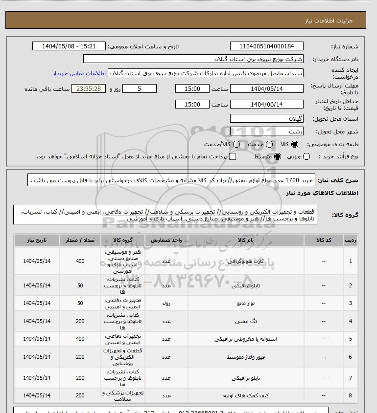 نام دستگاه خریدار:شرکت توزیع نیروی برق استان گیلان