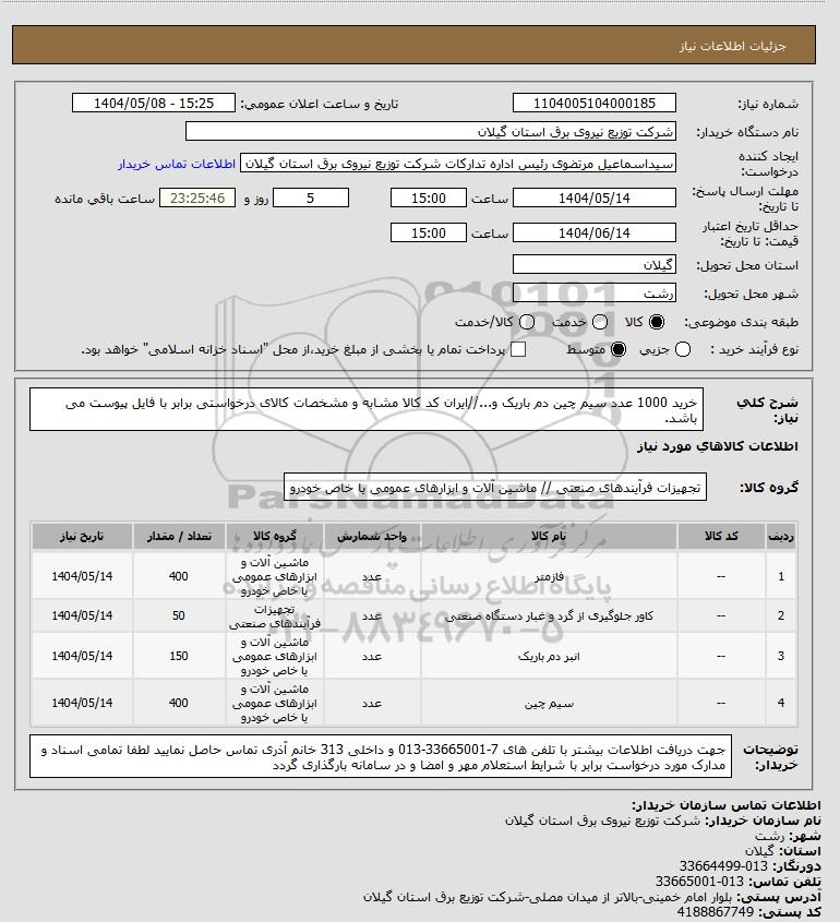 | 4 | -- | سیم چین | عدد | ماشین آلات و ابزارهای عمومی یا خاص خودرو | 400 | 1404/05/14 |