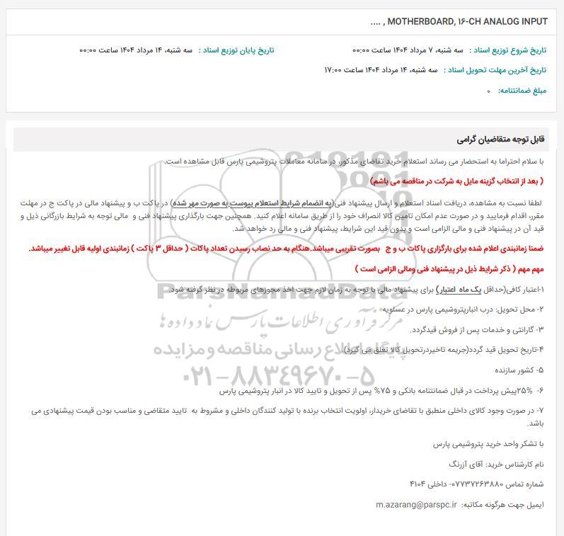 استعلام بها و موضوع استعلام استعلام ...., MOTHERBOARD, 16-CH ANALOG INPUT به اطلاع کلیه شرکتها و افراد متخصص واجد شرایط میرساند، آگهی گذار در نظر دارد از طریق استعلام بها، نسبت به انتخاب و دریافت پیشنهادات اقدام نماید. این استعلام با کد آگهی ثبت شده در سامانه خبرگزاری پارس نماد : 9346392 منتشر شده است. مشخصات استعلام : تاریخ شروع استعلام: 1404/05/08 آخرین مهلت ارسال پیشنهاد قیمت : 1404/05/14 و محل اجرای پروژه : استان بوشهر میباشد. استعلام قیمت مورد درخواست : استعلام ...., MOTHERBOARD, 16-CH ANALOG INPUT با دستهبندیهای تخصصی و گروه های مرتبط : کامپیوتر, استعلام اطلاع رسانی میگردد.