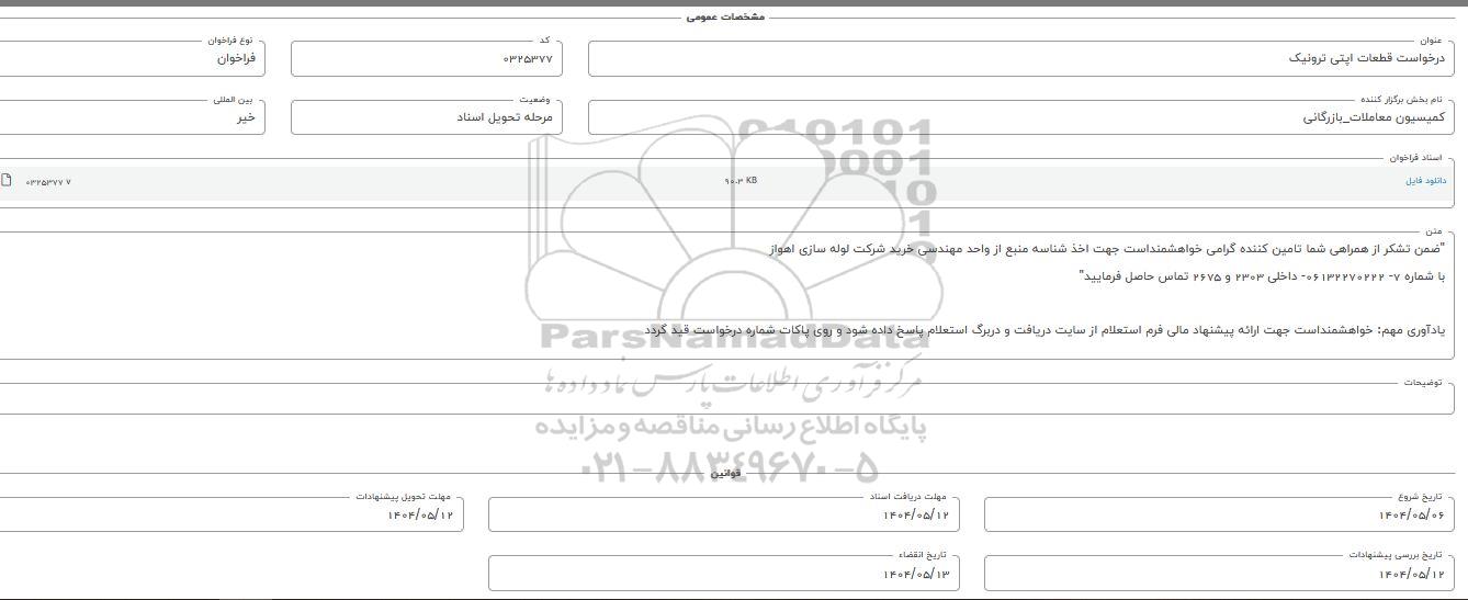 تاریخ بررسی پیشنهادات: 1404.05.12 - تاریخ انقضاء: 1404.05.13