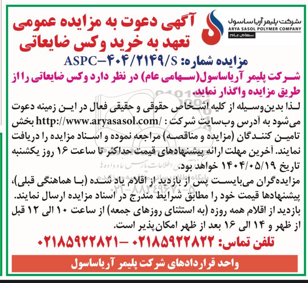 شرکت پلیمر آریاساسول (سهامی عام) در نظر دارد وکس ضایعاتی را از طریق مزایده واگذار نماید.