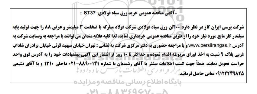 شرکت پرسی ایران گاز در نظر دارد 200 تن ورق سیاه فولادی شرکت فولاد مبارکه با ضخامت 3 میلیمتر و عرض 88 را جهت تولید پایه سیلندر گاز مایع مورد نیاز خود را از طریق مناقصه عمومی خریداری نماید. لذا کلیه علاقه مندان می توانند با مراجعه به وبسایت شرکت به آدرس www.persiirangas.ir و یا مراجعه حضوری به دفتر مرکزی شرکت به نشانی: تهران، خیابان سپهبد قرنی، خیابان برادران شاداب غربی، پلاک 9 نسبت به اخذ اوراق مربوطه اقدام نموده و حداکثر تا 10 روز از انتشار این آگهی پیشنهادات خود را به آدرس فوق واحد حراست تحویل نمایند . ضمناً جهت کسب اطلاعات بیشتر با آقای رشیدیان با شماره 88900141 - 021 داخلی 1310 و یا آقای تشیعی 09122249825 تماس حاصل فرمائید.