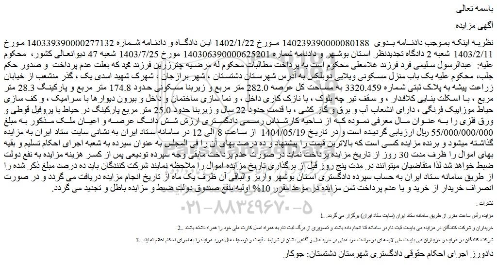 نظربه اینکه بموجب دادنامه بدوی 140239390000080188 مورخ 1402/1/22 این دادگاه و دادنامه شماره 140339390000277132 مورخ 1403/2/11 شعبه 2 دادگاه تجدیدنظر استان بوشهر و دادنامه شماره 140306390000625201 مورخ 1403/7/25 شعبه 47 دیوانعالی کشور، محکوم علیه: عبدالرسول سلیمی فرد فرزند غلامعلی محکوم است به پرداخت مطالبات محکوم له مرضیه چترزرین فرزند محمد که بعلت عدم پرداخت و صدور حکم جلب، محکوم علیه یک باب منزل مسکونی ویلایی دوبلکس به آدرس شهرستان دشتستان ، شهر برازجان ، شهرک شهید اسدی یک ، گذر منشعب از خیابان زراعت پیشه به پلاک ثبتی شماره 3320.459 به مساحت کل عرصه 282.0 متر مربع و زیربنا مسکونی حدود 174.8 متر مربع و پارکینگ 28.3 متر مربع ، با اسکلت بنایی کلافدار ، و سقف تیر چه بلوک ، با نازک کاری داخل ، و نما سازی ساختمان و داخل و بیرون دیوارها با سرامیک ، و کف سازی حیاط موزاییک فرنگی ، دارای انشعاب آب و برق و گاز کشی ، با قدمت حدود 22 سال و زیربنا حدود 25.0 متر مربع پارکینگ در حیاط با پروفیل قوطی و ورق فلزی را به عنوان مال معرفی نموده که از ناحیه کارشناس رسمی دادگستری ارزش شش دانگ عرصه و اعیان ملک مذکور به مبلغ 55/000/000/000 ریال ارزیابی گردیده است و در تاریخ 1404/05/19 از ساعت 8 الی 12 در سامانه ستاد ایران به نشانی سایت ستاد ایران به مزایده گذاشته میشود و برنده مزایده کسی است که بالاترین قیمت را پیشنهاد و ده درصد بهای آن را فی المجلس به عنوان سپرده به شعبه اجرای احکام تسلیم و بقیه بهای اموال را ظرف مدت 30 روز از تاریخ مزایده پرداخت نماید در صورت عدم پرداخت مابقی وجه سپرده تودیعی پس از کسر هزینه مزایده به نفع دولت ضبط خواهد شد لذا متقاضیان میتوانند در مدت پنج روز قبل از برگذاری تاریخ مزایده اموال را ملاحظه نمایند شرکت کنندگان باید ده درصد مبلغ ذکر شده را از طریق سامانه ستاد ایران به حساب سپرده دادگستری استان بوشهر واریز والباقی آن ظرف یک ماه از تاریخ انجام مزایده دریافت می گردد و در صورت انصراف خریدار از خرید و یا عدم پرداخت ثمن مزایده در موعد مقرر 10% اولیه بنفع صندوق دولت ضبط و مزایده باطل و تجدید می گردد.