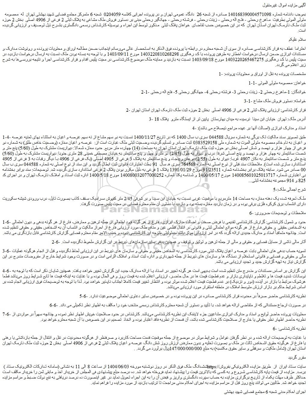 بموجب دادنامه شماره 140168390004571098 صادره از شعبه 26 دادگاه عمومی تهران و در پرونده اجرایی کلاسه 0204059 شعبه 6 متمرکز مجتمع قضایی شهید بهشتی تهران له معصومه متولی الموتی بطرفیت ماهرخ رحمتی - فتح اله رحمتی - زینت رحمتی - فرشته رحمتی - جهانگیر رحمتی مبنی بر دستور فروش ملک مشاعی به پلاک ثبتی 2 فرعی از 4906 اصلی بخش 2 حوزه ثبت ملک نارمک تهران استان تهران که در این خصوص حسب تقاضای خواهان پلاک ثبتی مذکور توسط این اجراء و بوسیله کارشناس رسمی دادگستری بشرح ذیل توصیف و ارزیابی گردیده است.