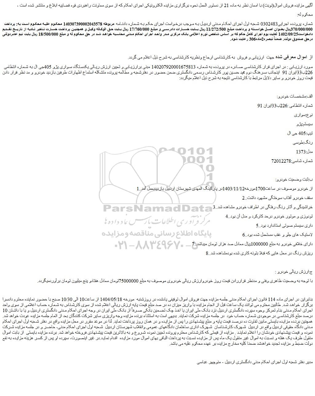 مورد ارزیابی : در اجرای قرار کارشناسی صادره در پرونده به شماره 140207920001675813 مبنی برارزیابی و تعیین ارزش ریالی یکدستگاه سواری پژو 405جی ال به شماره انتظامی 226ب33ایران 91 اینجانب سرهنگ دوم محمد حسین پور کارشناس رسمی دادگستری ضمن حضور در دفترشعبه و مطالعه پرونده متشکله استماع اظهارات طرفین بازدید خودرو و مد نظر قرار دادن قیمت روز خودرو و سایر دلایل مرتبط با کارشناسی نتیجه به شرح ذیل اعلام میگردد: