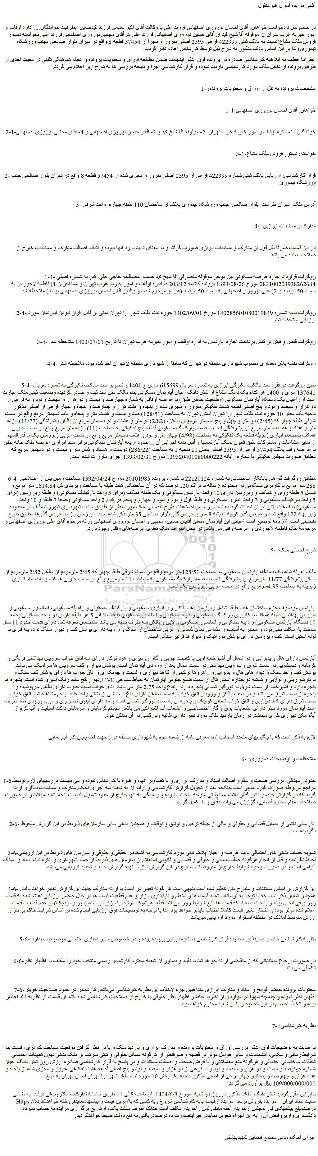 مزایده عمومی مزایده پلاک ثبتی شماره 422399 فرعی از 2395 اصلی مفروز و مجزی شده از 57454 قطعه 8 برگزار میگردد. از کلیه افراد متخصص و شرکتهای واجد شرایط دعوت به عمل میآید تا در این مزایده با کد خبرگزاری پارس نماد : 9347184 شرکت نمایند تاریخ شروع مزایده : 1404/05/06 مهلت شرکت در مزایده: تا پایان روز 1404/06/03