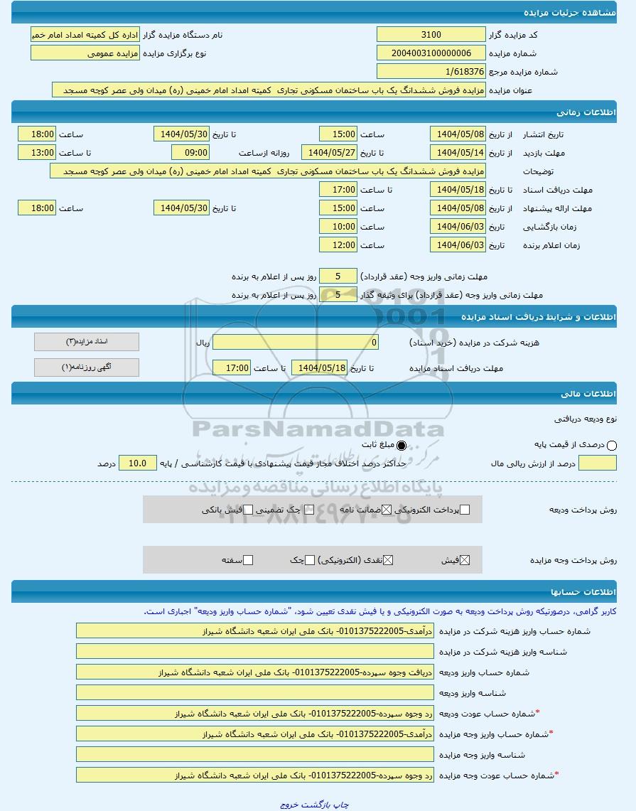 عنوان مزایدهمزایده فروش ششدانگ یک باب ساختمان مسکونی تجاری کمیته امداد امام خمینی (ره) میدان ولی عصر کوچه مسجد -مزایده ساختمان و مغازه - استان فارس