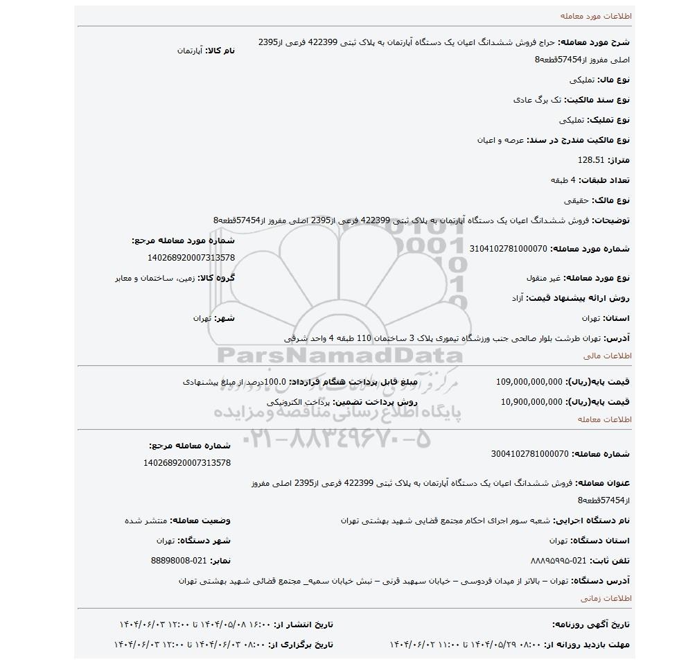 عنوان معامله: فروش ششدانگ اعیان یک دستگاه آپارتمان به پلاک ثبتی 422399 فرعی از2395 اصلی مفروز از57454قطعه8