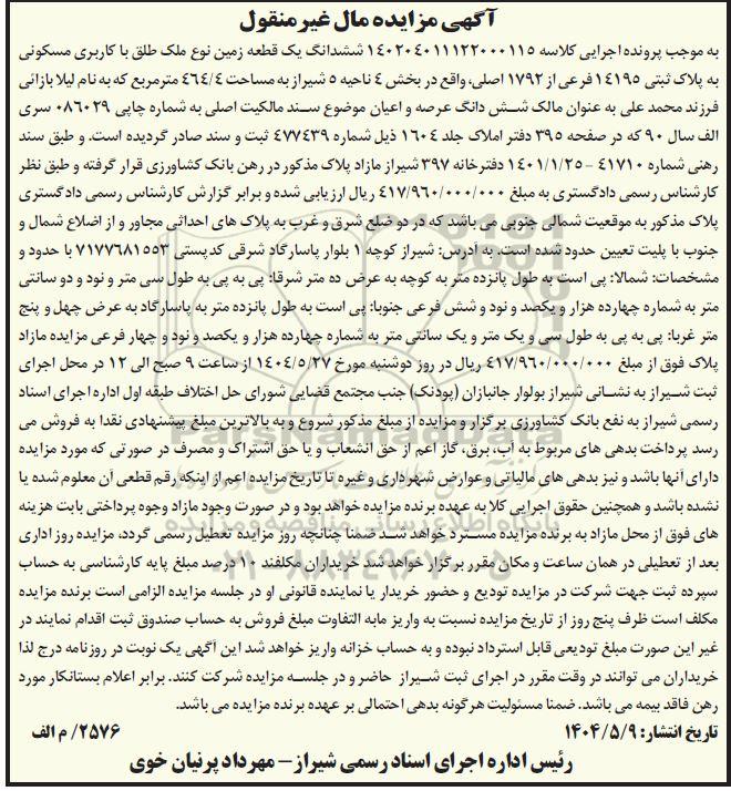 مزایده عمومی مزایده ششدانگ یک قطعه زمین با کاربری مسکونی مساحت 464.4 مترمربع برگزار میگردد. از کلیه افراد متخصص و شرکتهای واجد شرایط دعوت به عمل میآید تا در این مزایده با کد خبرگزاری پارس نماد : 9347733 شرکت نمایند تاریخ شروع مزایده : 1404/05/09 مهلت شرکت در مزایده: تا پایان روز 1404/05/27 مکان برگزاری اموال واگذاری استانهای فارس و دستهبندیهای مربوط به این حراجی املاک و زمین میباشد.