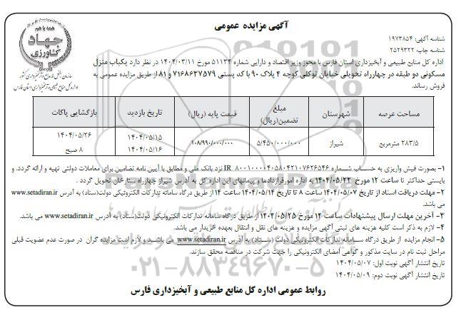 مزایده فروش یکباب منزل مسکونی دو طبقه- نوبت دوم , مزایده فروش یکباب منزل مسکونی دو طبقه- نوبت دوم
